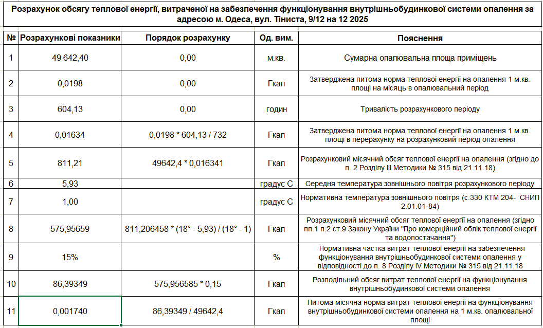 ☝ Розрахунок обсягу теплової енергії, витраченої на забезпечення функціонування внутрішньобудинкових систем опалення за адресою вул. Тіниста 9/12 на грудень 2025 р.
