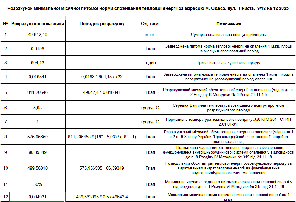 ☝ Розрахунок мінімальної місячної питомої норми споживання теплової енергії за адресою вул.Тіниста 9/12 на грудень 2025 р.